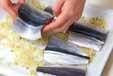 天板にオーブンペーパーを敷き、混ぜ合わせた<ハーブパン粉>を薄く敷き、サンマの内側を下にして並べる。