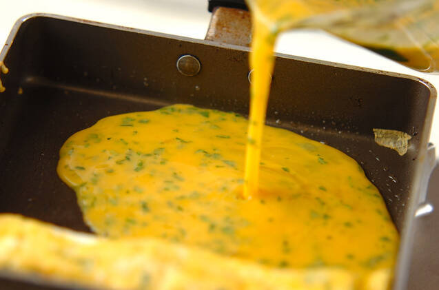 もう一度サラダ油を薄くひき、残りの卵液の1/2量を流し入れ、向こう側から手前に巻き、最後の卵液も同様にして巻く。