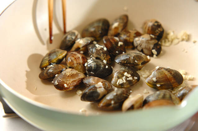 フライパンにサラダ油を熱し、アサリとニンニクを軽く炒め、酒大さじ2を加えてフライパンに蓋をして蒸し煮にする。