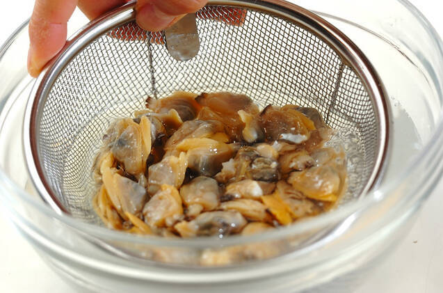 アサリはザルに入れ、分量外の塩水で振り洗いし、水気をきる。(ヒント)アサリのむき身がない場合は、殻付のアサリをサッとゆでて身をはずして下さい。ゆで過ぎると身がしまってかたくなるので、貝の口が開いたらOKです。