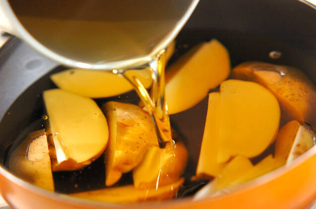 フライパンにジャガイモを入れて、常温の揚げ油をヒタヒタになるまで注ぎ入れ、中火にかける。