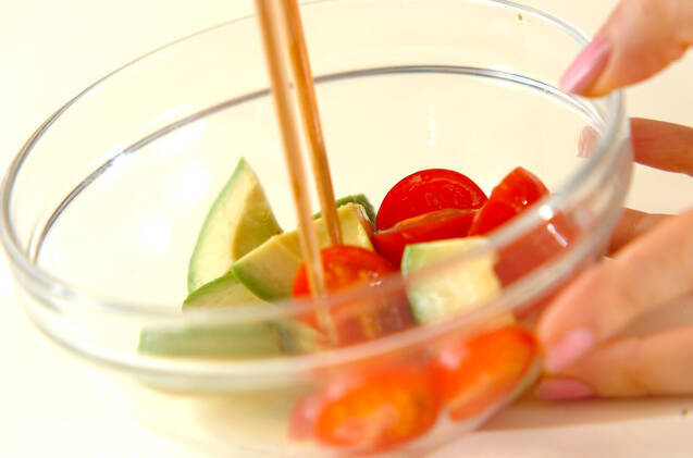 プチトマトは水洗いして水気を拭き取り、ヘタを取って縦2~4つに切り、(1)のアボカドに合わせる。