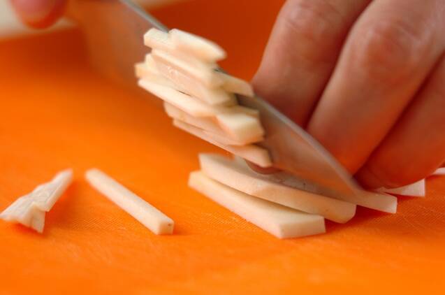 里芋は皮をむき、せん切りにする。