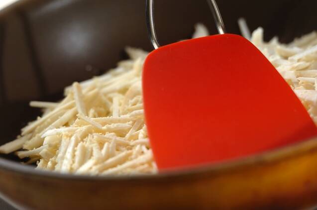 フライパンにサラダ油を入れて中火にかけ、温まったら(1)を薄く広げる。触らないで弱火から中火でそのまま焼く。