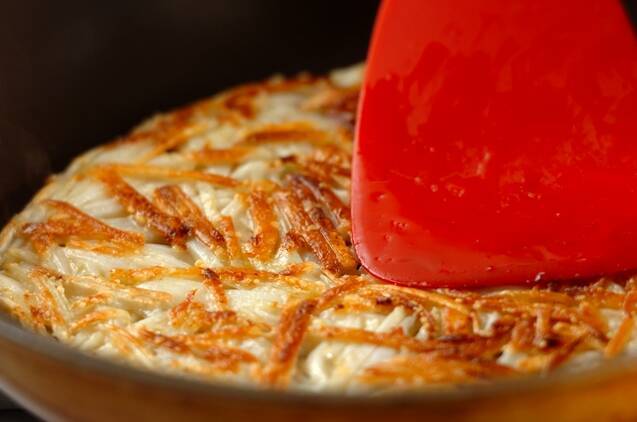 フライ返しで押さえながら、両面が焼けたら皿に移して粗びき黒コショウを振る。