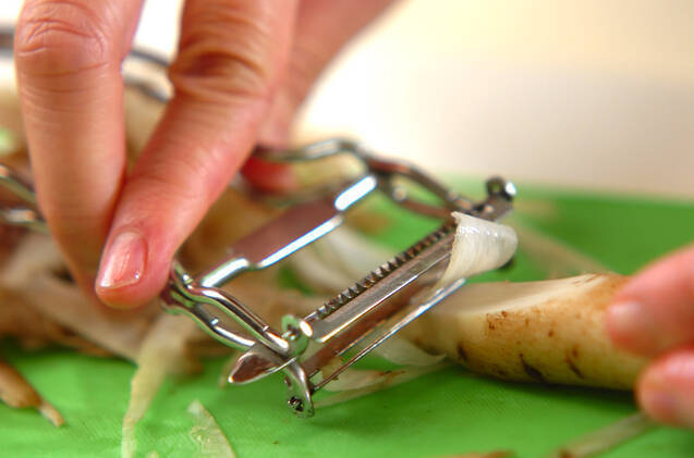 ゴボウはタワシできれいに水洗いし、ピーラーでささがきにして水に放つ。