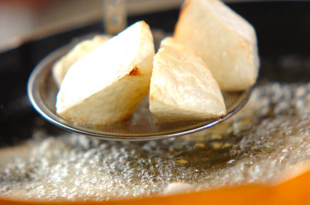 大根は皮をむいてひとくち大の乱切りにし、深めのフライパンに入れて常温の揚げ油をひたひたまで注ぎ、中火にかける。ジュワジュワと大きな泡から、シュワシュワと小さな泡になったら、少し火を弱めて薄く揚げ色がつくまで揚げる。