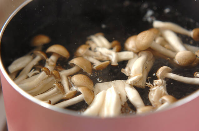 熱湯でシメジをサッとゆでてザルに上げ、熱いうちに<ゴマダレ>のボウルに加えて合わせる。