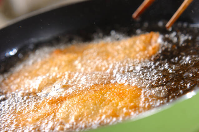 170℃の揚げ油に静かに入れ、ジュワジュワと言っていた泡がシュワシュワと小さな泡になり、美味しそうなキツネ色になったら油から上げ、油を切る。