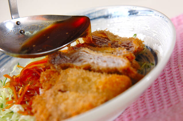 器に合わせたキャベツを盛り、煮た玉ネギとニンジンをのせて、食べやすい大きさに切ったトンカツをのせる。<合わせスープ>を掛け、刻みネギを散らせる。