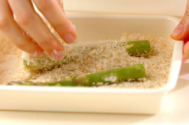 エビの水気を押さえて塩コショウを振り、<衣>の小麦粉、溶き卵、パン粉を順につける。グリーンアスパラも同様に<衣>をつける。