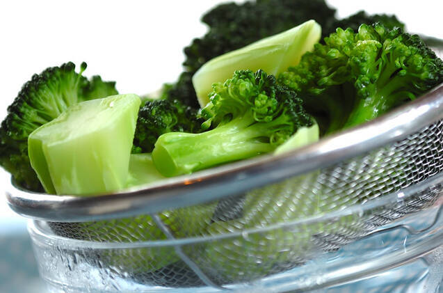 熱湯でブロッコリーをお好みのかたさになるまでゆで、ザルに上げる。