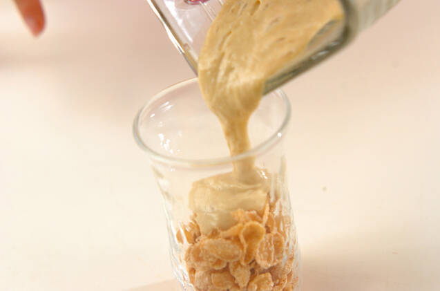 器にコーンフレーク、(1)、アイスクリームを盛り合わせ、ミントの葉を飾る。