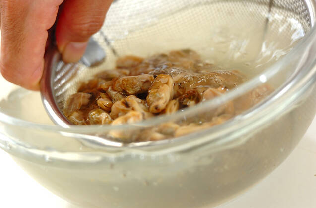 アサリは水気をきり、塩水で洗う。