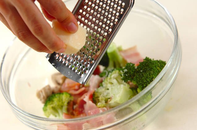 汁気をきって塩コショウをし、パルメザンチーズをすりおろしながら加え、サッと和えて器に盛る。
