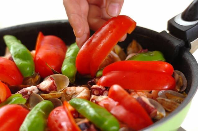 パプリカ、ピーマンを並べ更に蓋をして2~3分煮る。蓋をはずして少し火を強め、4~5分余分な水分を飛ばす。