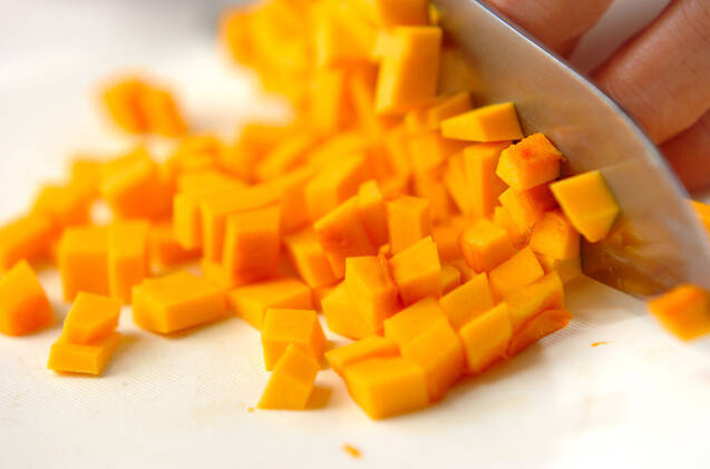 カボチャは種を取り、皮を削ぎ落として細かく切る。