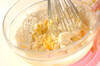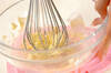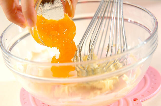 ボウルにバターとマンゴージャムを入れ、泡立て器でしっかり混ぜ合わせ、卵白を2回に分けて加え混ぜる。