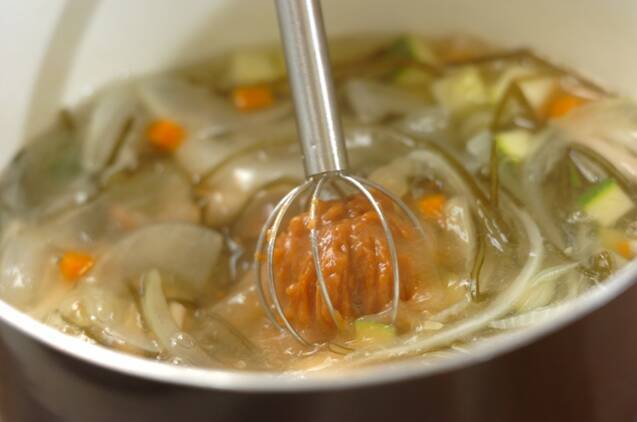 ニンジンが柔らかくなったらみそを溶き、ショウガを加えて器に注ぐ。