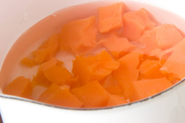板コンニャクはかぶるくらいの水と鍋に入れ、中火でゆでて臭みを抜き、ザルに上げる。