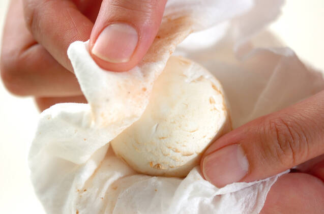 マッシュルームは固く絞ったぬれ布巾で汚れを拭き取り、4等分に切る。