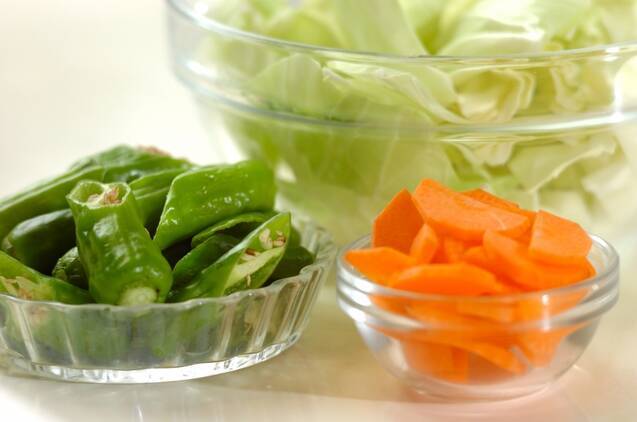 キャベツはザク切りにする。ニンジンは皮をむき、半月、またはイチョウ切りにする。シシトウは軸を切り落とし、斜め半分に切る。ニンニクは芽を取り、薄切りにする。<調味料>の材料を混ぜ合わせる。