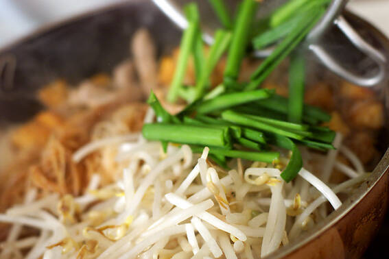 ニラ、モヤシを加えてサッと混ぜる程度で火を止め、ピーナッツ、レモン汁を混ぜ合わせていったん取り出す。