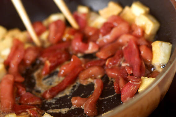 フライパンにサラダ油大2を強火で熱し、厚揚げをカリっとなるまで炒め、豚肉を加えて更に炒めあわせる。