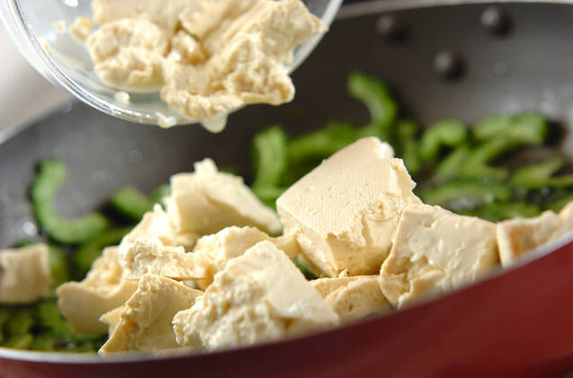 ゴーヤ、木綿豆腐、赤パプリカ、赤唐辛子、<調味料>の材料を加え、炒め合わせる。