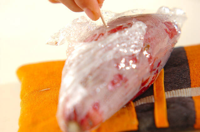 サツマイモは皮ごときれいに水洗いし、ぬれたままラップで包んで、電子レンジで6~8分(途中で向きを変えて)竹串がスッと刺さるまで加熱する。電子レンジは600Wを使用しています。