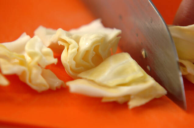 キャベツは3~4cmの角切り、ピーマンは縦半分に切りヘタと種を取り、乱切りにする。