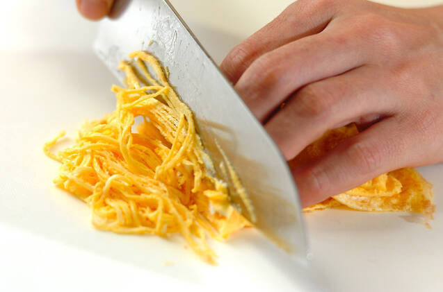 <錦糸卵>を作る。<錦糸卵>の材料をよく混ぜ合わせ、薄くサラダ油をひいて熱したフライパンに一気に流し入れ、卵液を全体に広げる。表面が乾いてきたらひっくり返し、まな板に出して冷めたら細切りにする。