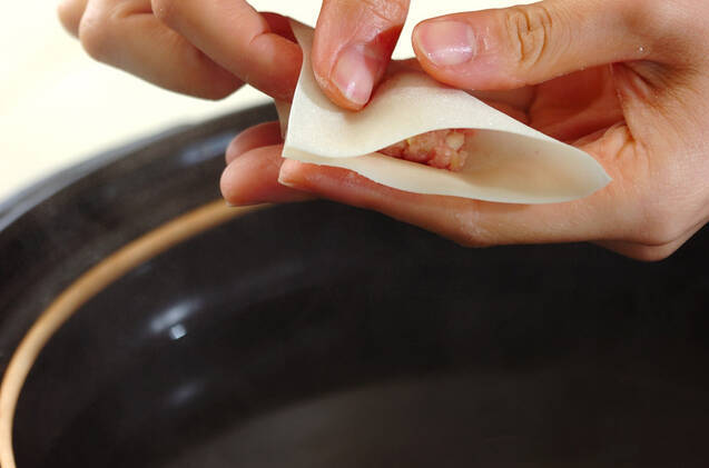 <タネ>は、少量をワンタン皮で包みながら鍋に入れ、またはそのまま小さめにスプーンですくって落とし入れる。