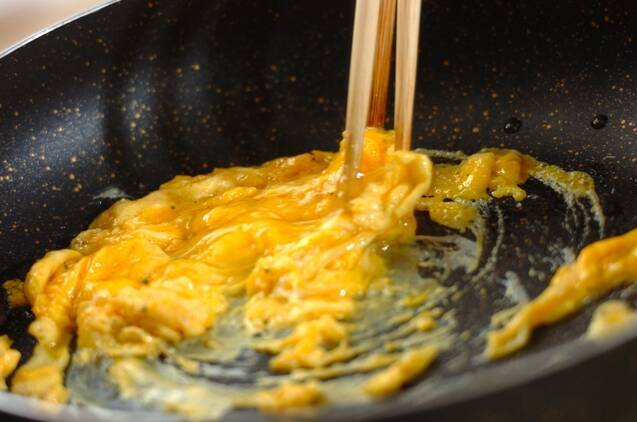 ボウルに卵を割りほぐし、塩コショウを混ぜる。フライパンに半量のゴマ油を温め、やわらかめの炒り卵を作り、ボウルにもどす。
