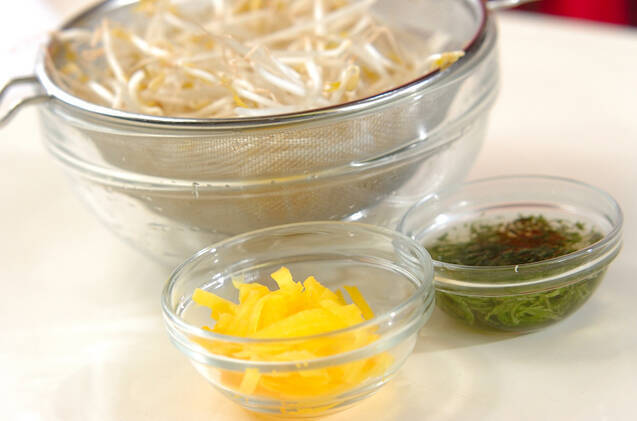 モヤシはたっぷりの水に放ち、パリッとしたらザルに上げ、水気をきる。