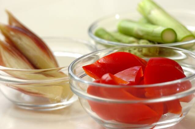 グリーンアスパラは根元のかたい部分を切り落とし、ハカマを取り除いて長さを4等分に切る。赤パプリカはヘタと種を取り除き、乱切りにする。ミョウガは縦半分に切る。
