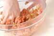 ボウルに肉、炒めた玉ネギ、パン粉、牛乳、塩コショウ、卵、ナツメッグ、すりおろしたニンジンを入れ、手でよく粘りが出るまで混ぜ合わせる。