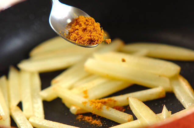 フライパンにサラダ油を熱し、ジャガイモを焼き色がつくまで焼く。カレー粉、塩で味を調える。