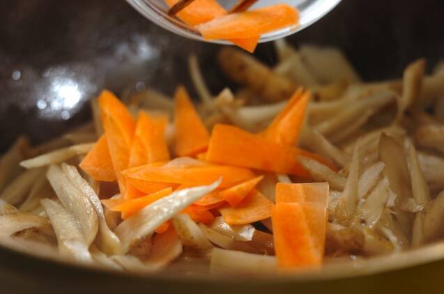 フライパンに分量外のサラダ油をひき、ゴボウと砂糖を加え、中火で炒める。ゴボウがしんなりしたら、ニンジンを加えて炒める。