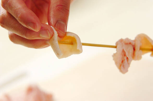 竹串に鶏もも肉、白ネギを交互に刺す。鶏皮は半分に折り、竹串で刺す。竹串の手で持つ部分には、焦げないようにアルミホイルを巻く。