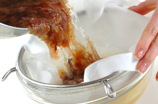 ボウルにザルを重ね、キッチンペーパーをのせる。昆布とかつお節を取りだし、キッチンペーパーでこす。キッチンペーパーを軽く押さえてだし汁を絞る。