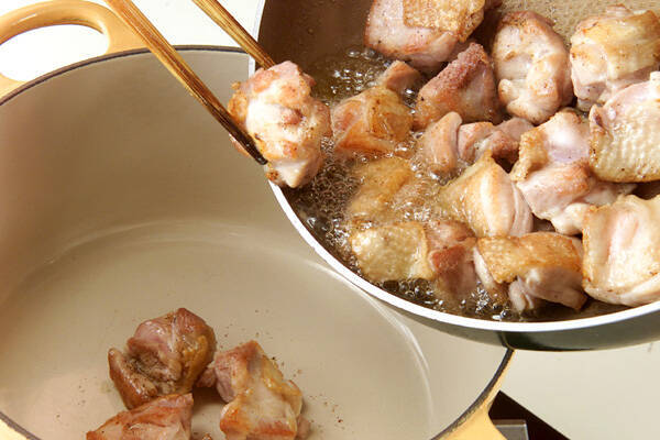 フライパンにオリーブ油大1を入れて中火にかけ、鶏もも肉を並べ、全体に焼き色が付くまで焼き、煮込み鍋に移す。