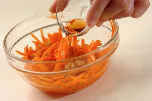 (1)に酢と赤唐辛子、干しエビをゆで汁ごと加えて菜ばしで混ぜ合わせる。ナンプラー、塩を加えて味を調える。
