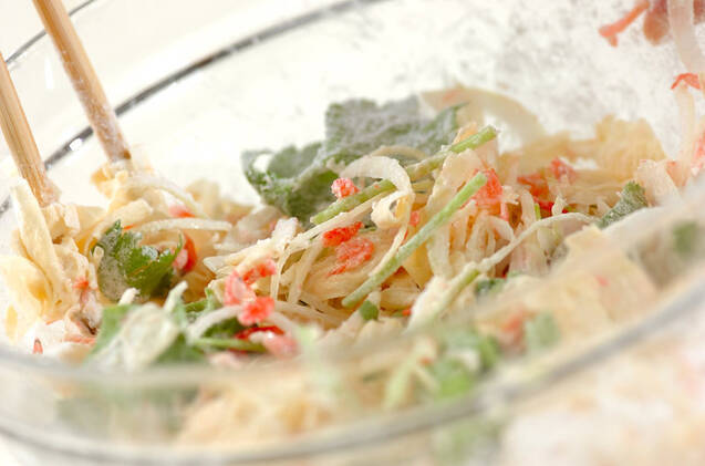 湯葉、玉ネギ、ミツバ、干し桜エビをボウルに合わせる。そこへ<衣>の小麦粉、片栗粉を入れて全体にからめ、冷水を少しずつ加えながら薄めの衣に仕上げる。