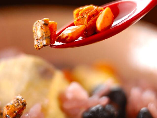 お茶椀によそって、お好みで山椒あられを散らせる。土鍋のまま食卓に出してもいいですね!