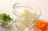 <ドライカレー>を作る。玉ネギは皮をむき、細かいみじん切りにし、ニンジンは皮をむき、細かいみじん切り、又は粗目にすりおろす。ピーマンは縦半分に切り、ヘタと種を取り、玉ネギに合わせてみじん切りに、ニンニクは芽を取り、みじん切りにする。