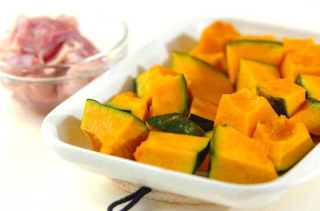 カボチャは種とワタを取ってひとくち大に切り、耐熱容器に入れてラップをかけ、電子レンジで4~5分加熱する。電子レンジは600Wを使用しています。