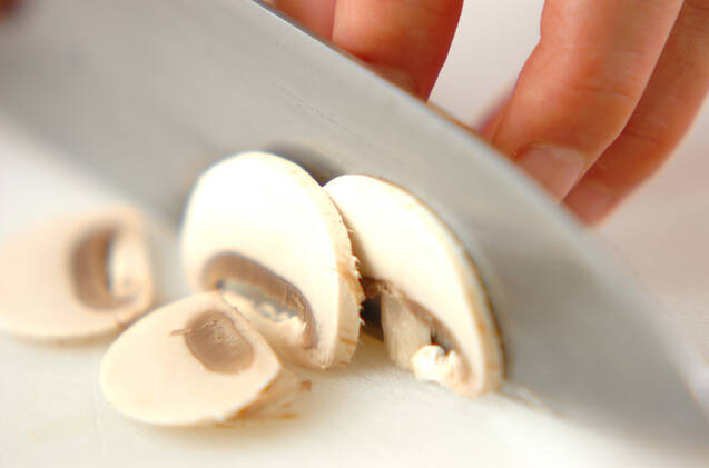 マッシュルームは石づきを切り落とし、汚れを拭き取って薄切りにする。