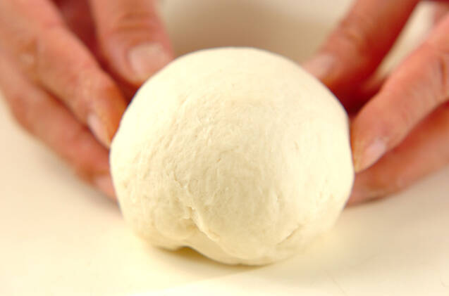 生地がまとまってきたら、手の平で表面がなめらかになるまでしっかりとこね、ラップで包み10分置く。