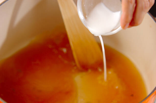 煮立ってきたら火を弱め、鍋の蓋をして60分コトコト煮込む。キャベツを取り出し<水溶き片栗>でトロミをつける。